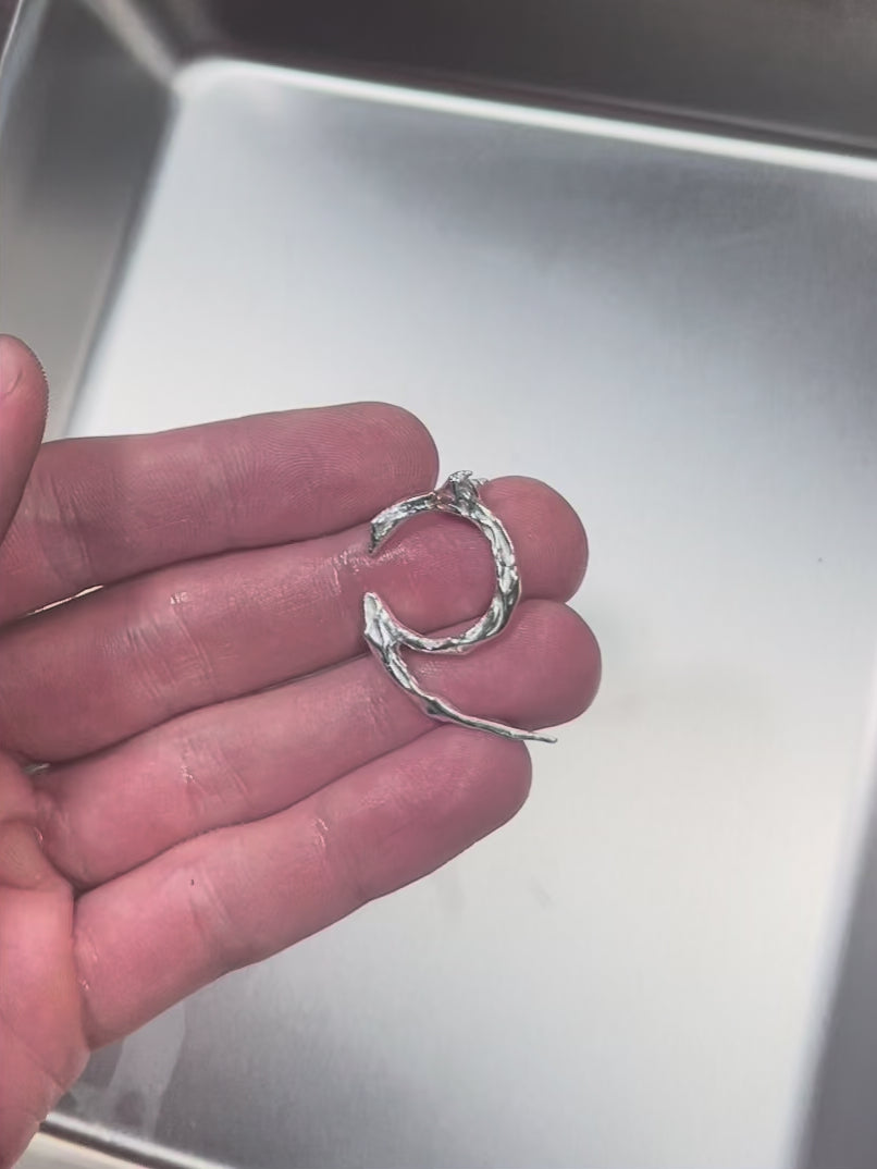 A Loki favourite, this piece is both a statement and so lightweight that it is wearable everyday. An orbit of armour for the ear, bearing the energy of a scorpion or spider mother. Her orbit is helicoidal – both cyclical and evolutionary she pierces the membrane of the mundane. Handmade in Australia entirely from post-consumer recycled sterling silver.